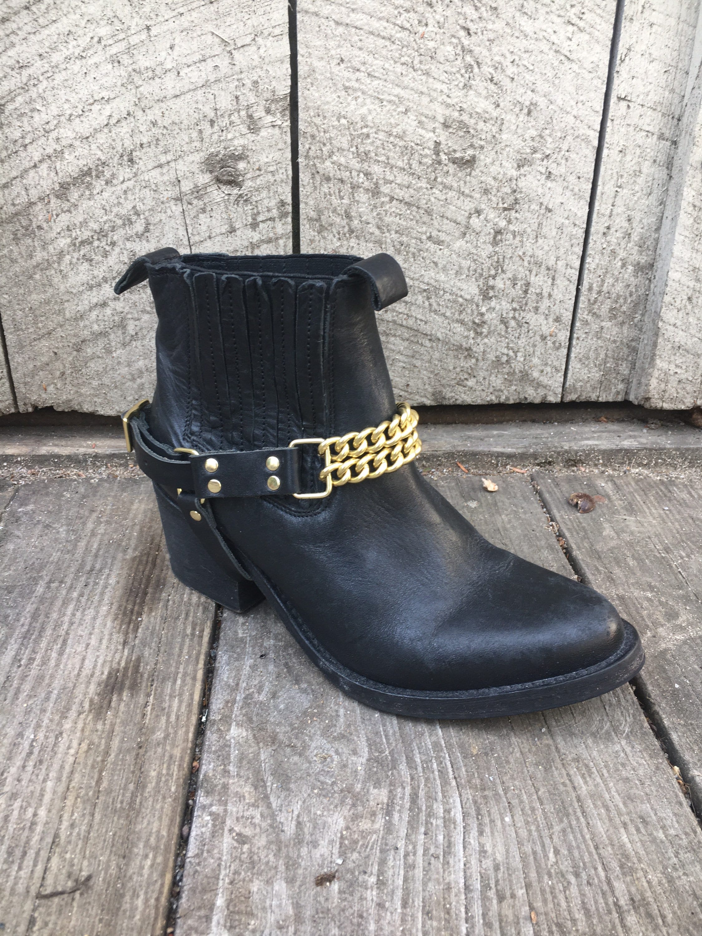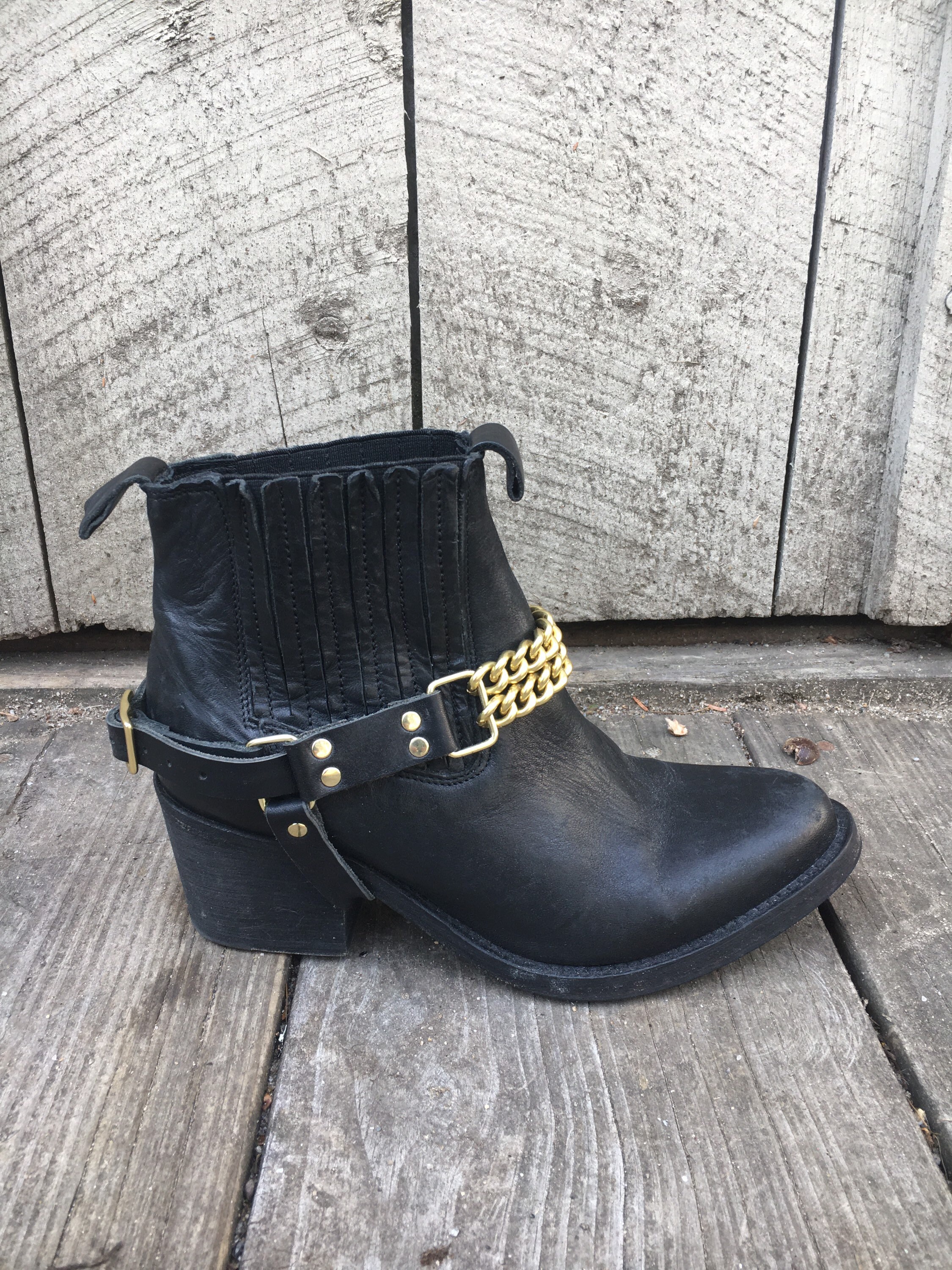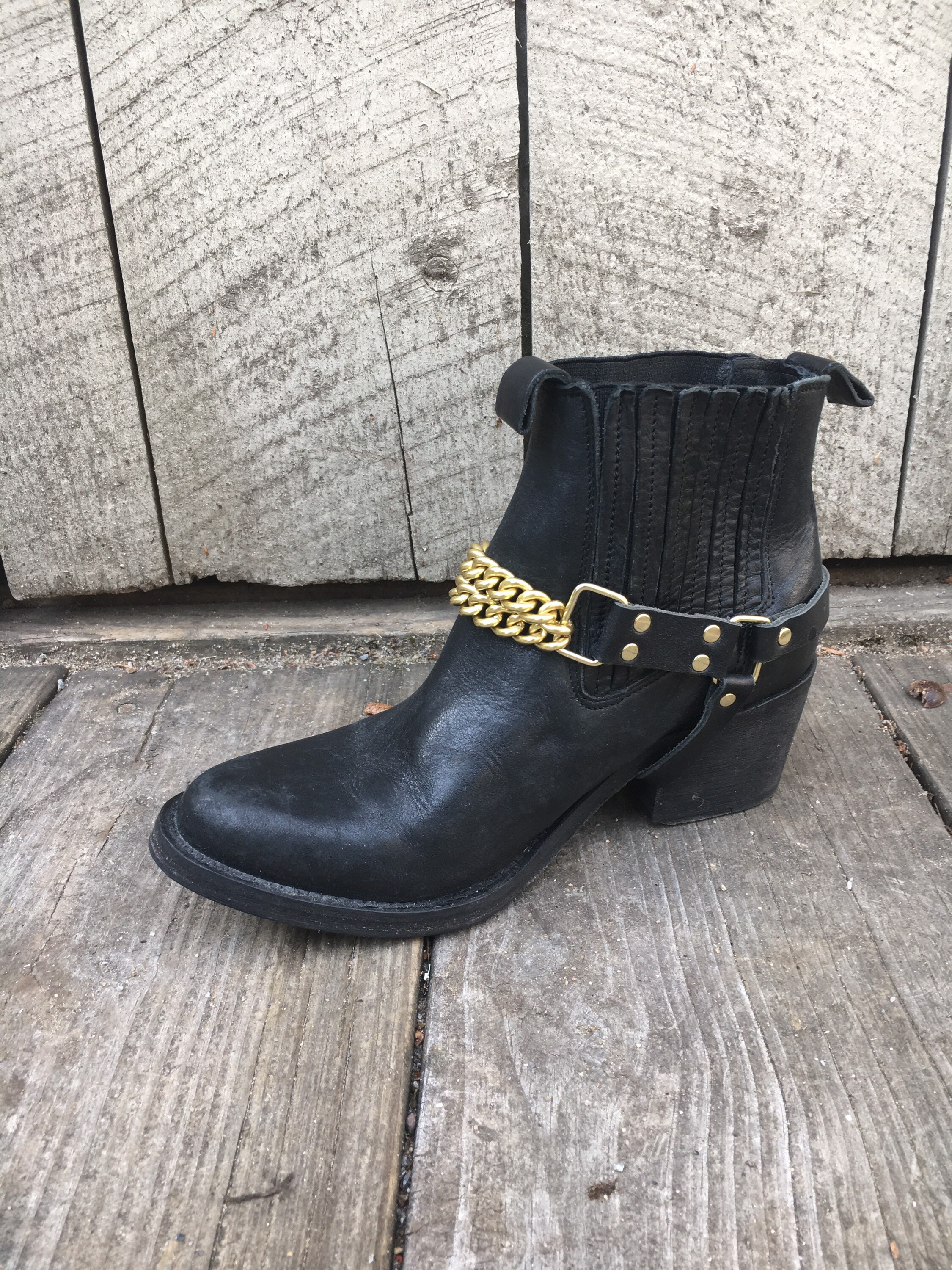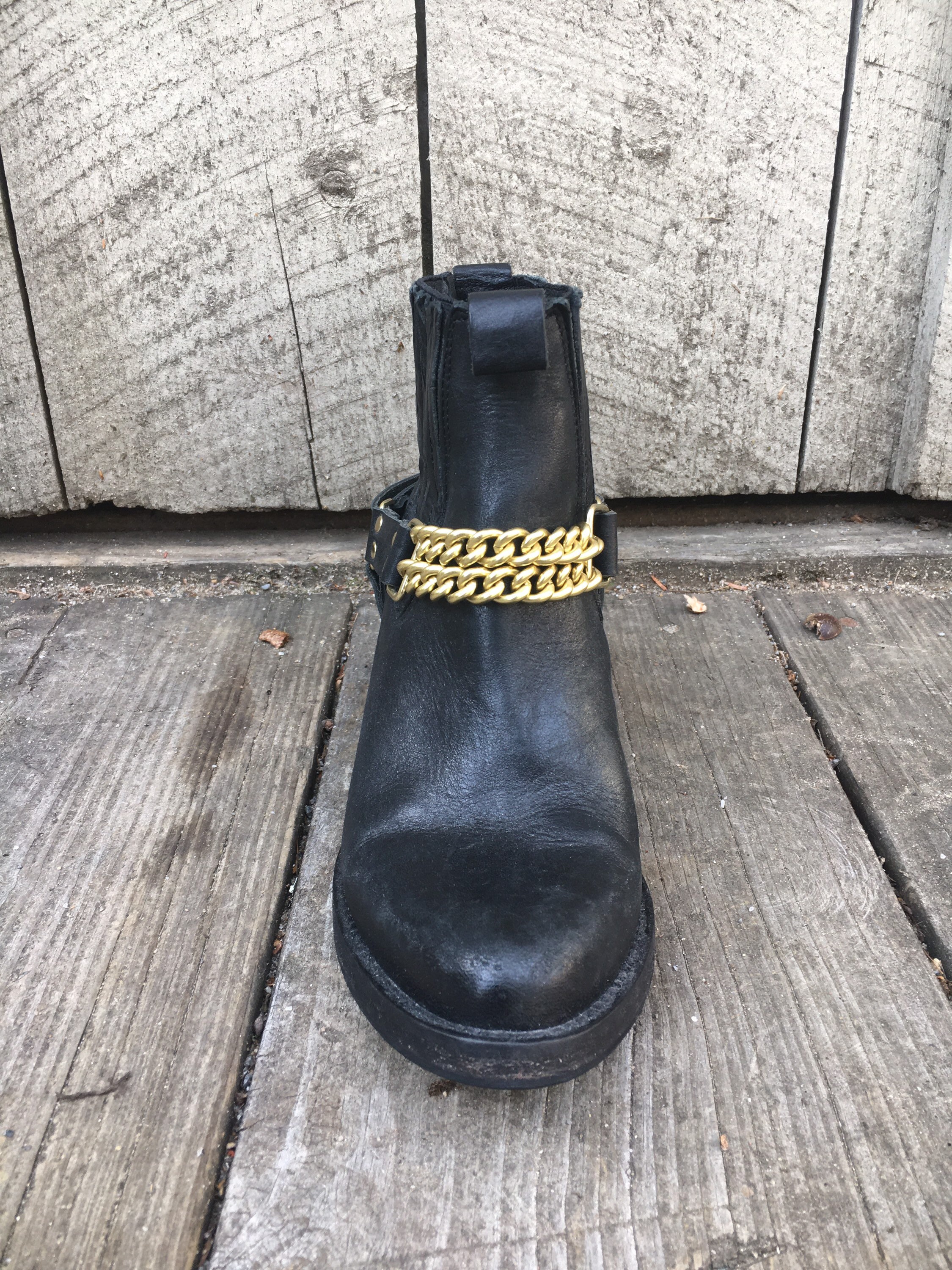 Add some heavy Metal to your boot! Double front gold chains with black leather.